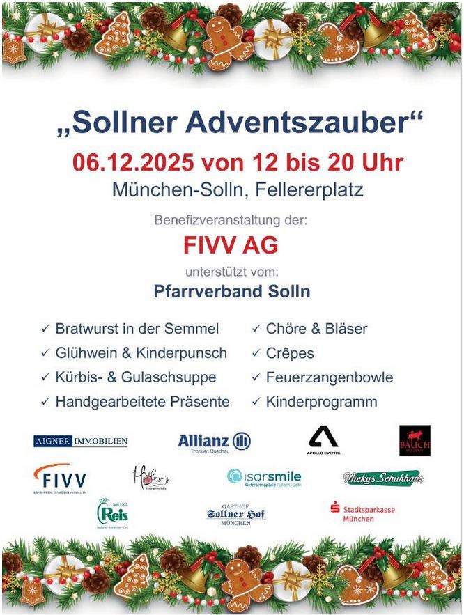 Die Benefizveranstaltung der FIVV AG, unterstützt vom Pfarrverband Solln, bietet nicht nur eine wunderbare Gelegenheit, in weihnachtliche Stimmung einzutauchen – sondern auch, sich für einen guten Zweck zu engagieren und mit Ihrer Spende Gutes zu bewirken.